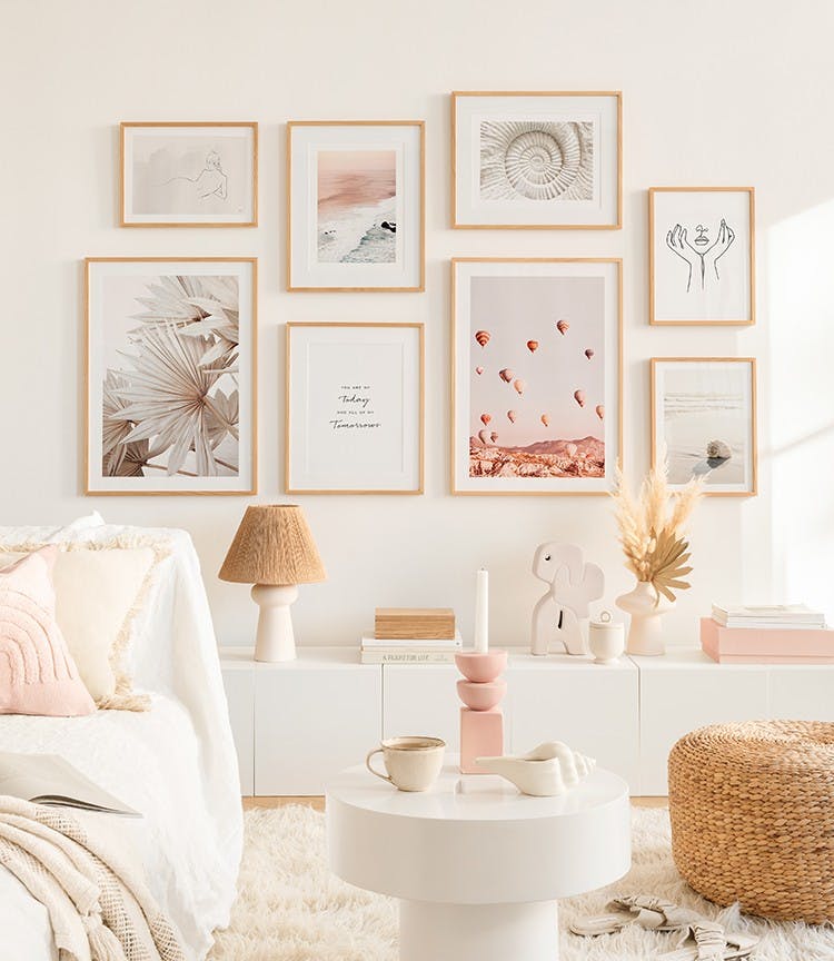 Light illustrations and photographs with a summer feel in oak wood frames for the living room