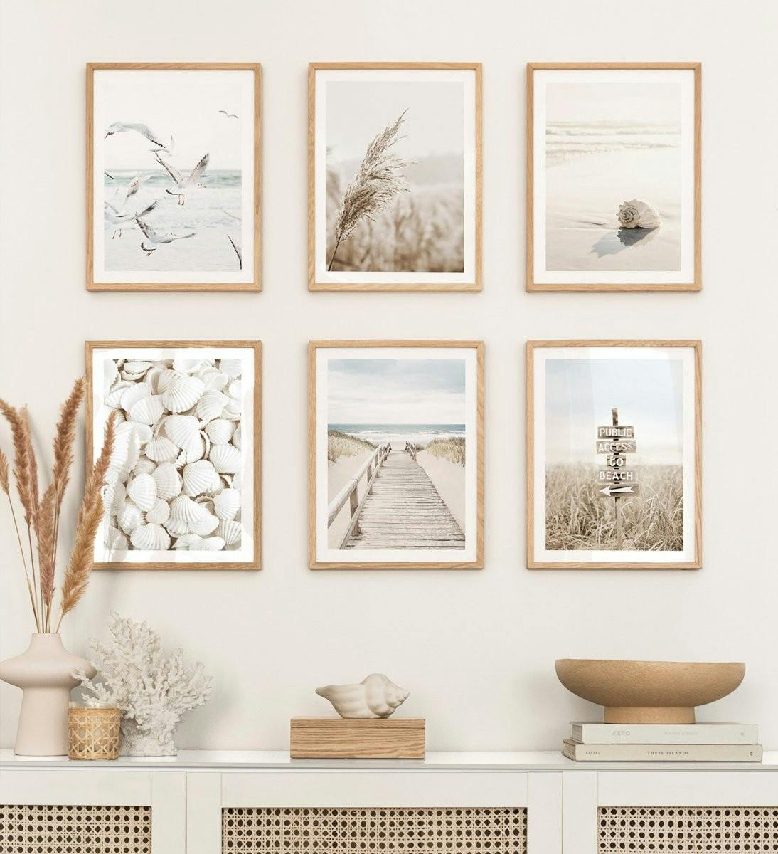 Serene gallery wall in beige with a beach theme with oak frames for living room