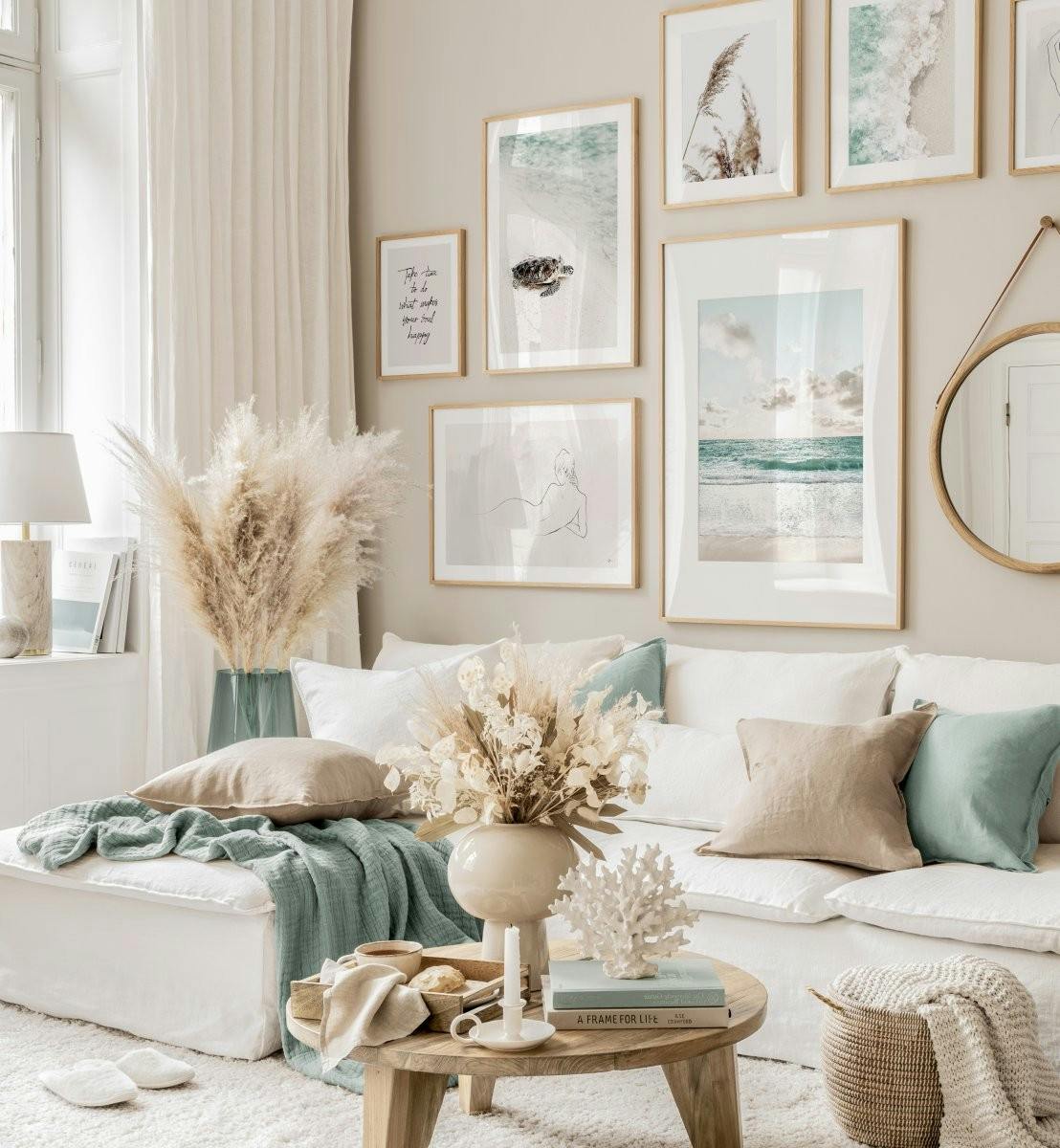Summer breeze gallery wall beach wall art turtle prints line art posters oak frames
